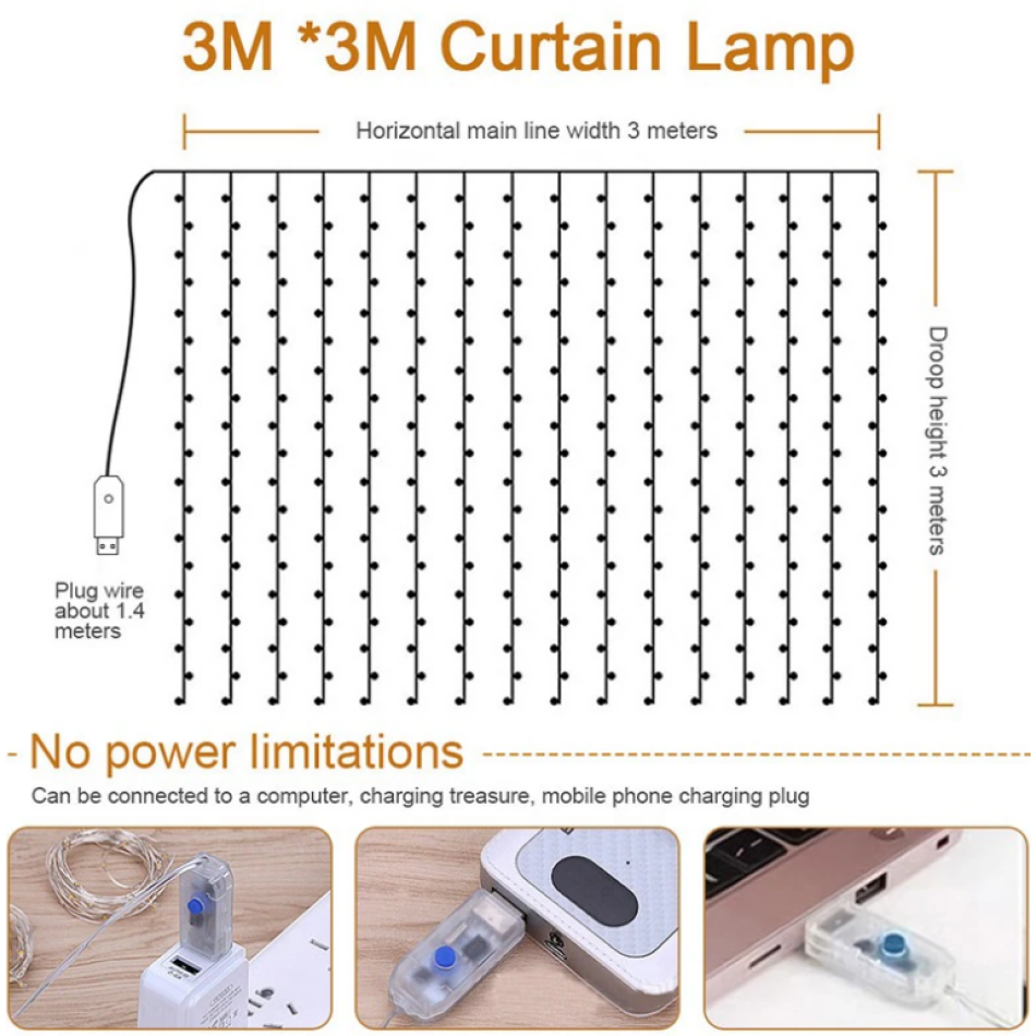 Размеры такой гирлянды 3 х 3 метра, она состоит из 10 линий и 300 светодиодов. В комплекте идет пульт с 8-ю режимами свечения и кнопкой Timer. Светящаяся шторка может работать от любого источника USB - компьютера, смарфона, Power Bank. Такую гирлянду можно применять как для интерьеров, так и для уличного освещения.